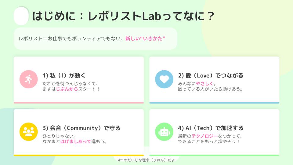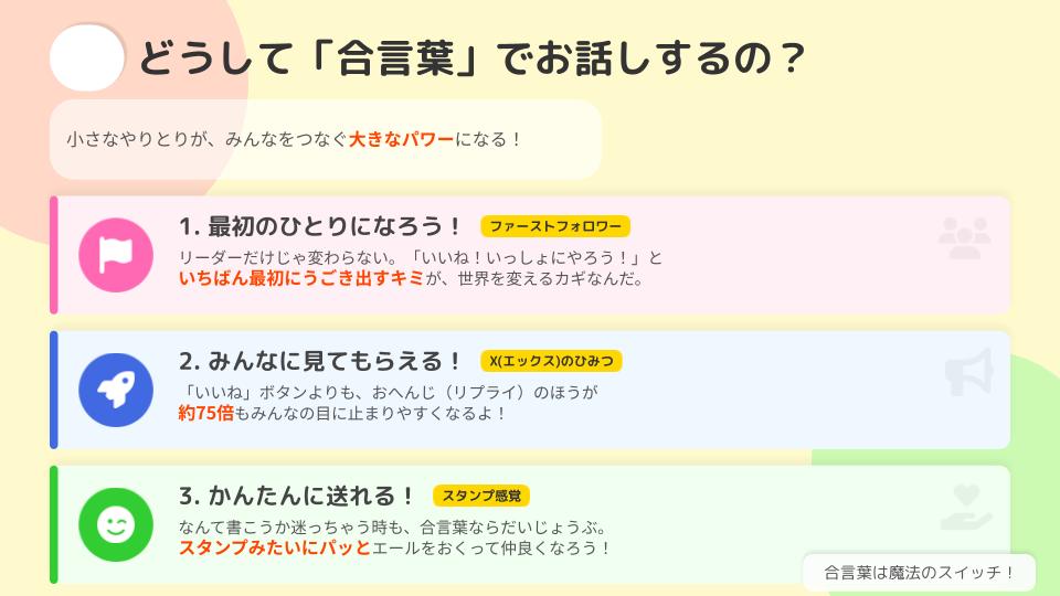合言葉は、レボリストLabにおける"魔法のスイッチ"です。小さなやりとりが、みんなをつなぐ大きなパワーになります。