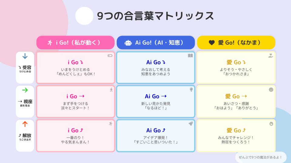 3つのカテゴリは「i Go!(私が動く)」「Ai Go!(AI・知恵)」「愛 Go!(なかま)」。そして3つの段階は「受容(うけとめる)」「視座(前を見る)」「解放(うごき出す)」です。