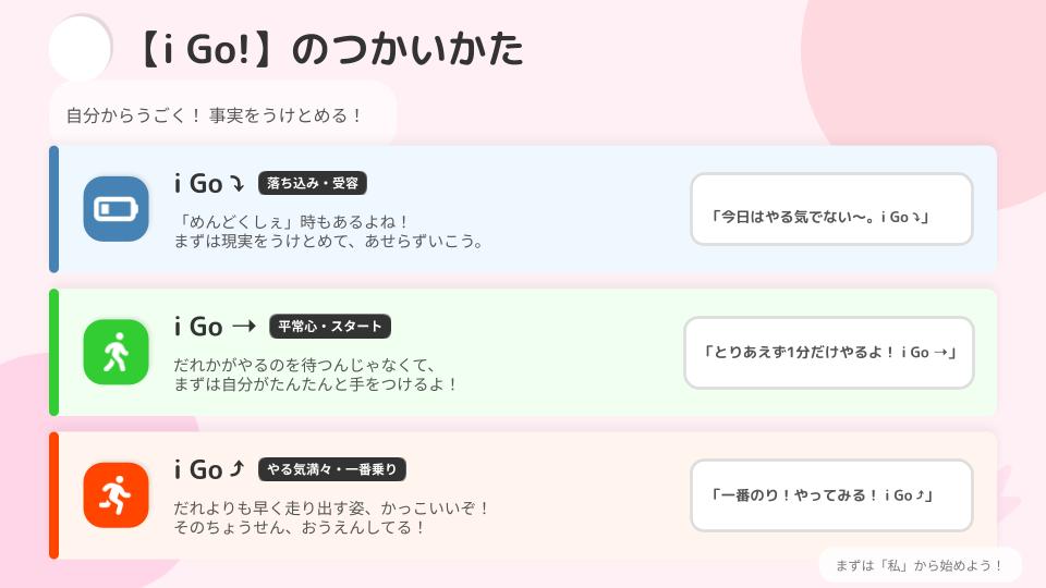 「i Go →」(平常心・スタート)── だれかがやるのを待つんじゃなくて、まずは自分がたんたんと手をつけるよ!使い方の例:「とりあえず1分だけやるよ! i Go →」