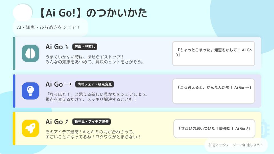 「Ai Go!」は、AI・知恵・ひらめきをシェアするための合言葉です。一人で悩まず、みんなの知恵を集めて前に進みましょう。