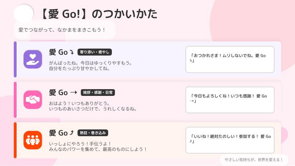 「愛 Go!」は、愛でつながって、なかまをまきこむための合言葉です。やさしさと感謝の気持ちを、言葉にして届けましょう。