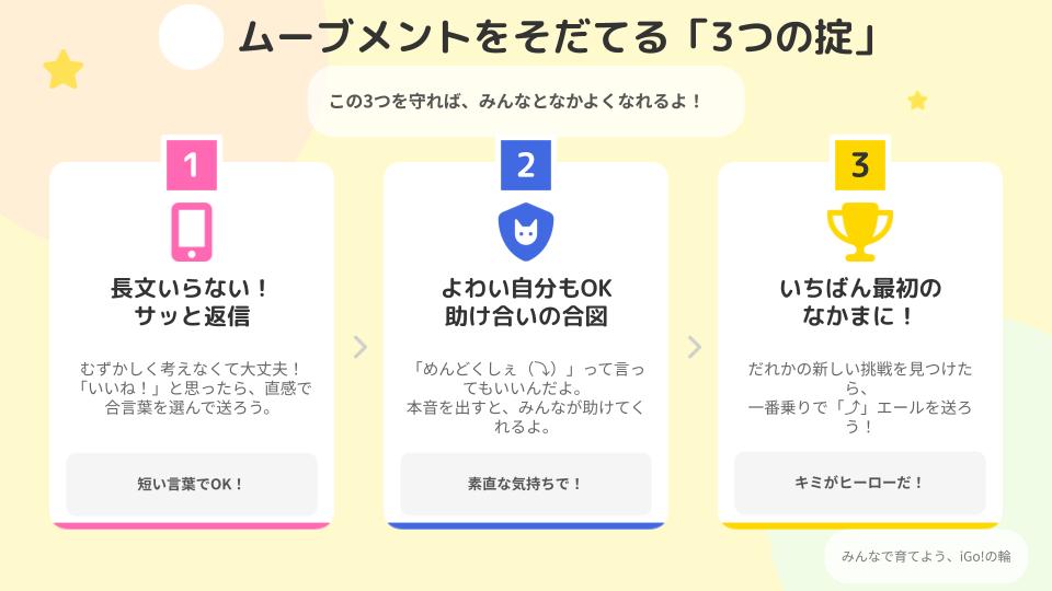 掟その3「いちばん最初のなかまに!」── だれかの新しい挑戦を見つけたら、一番乗りで「♪」エールを送ろう!キミがヒーローだ!