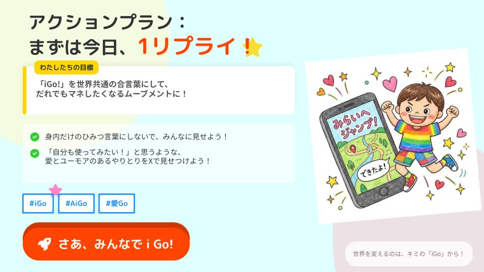 わたしたちの目標は、「iGo!」を世界共通の合言葉にして、だれでもマネしたくなるムーブメントにすること。